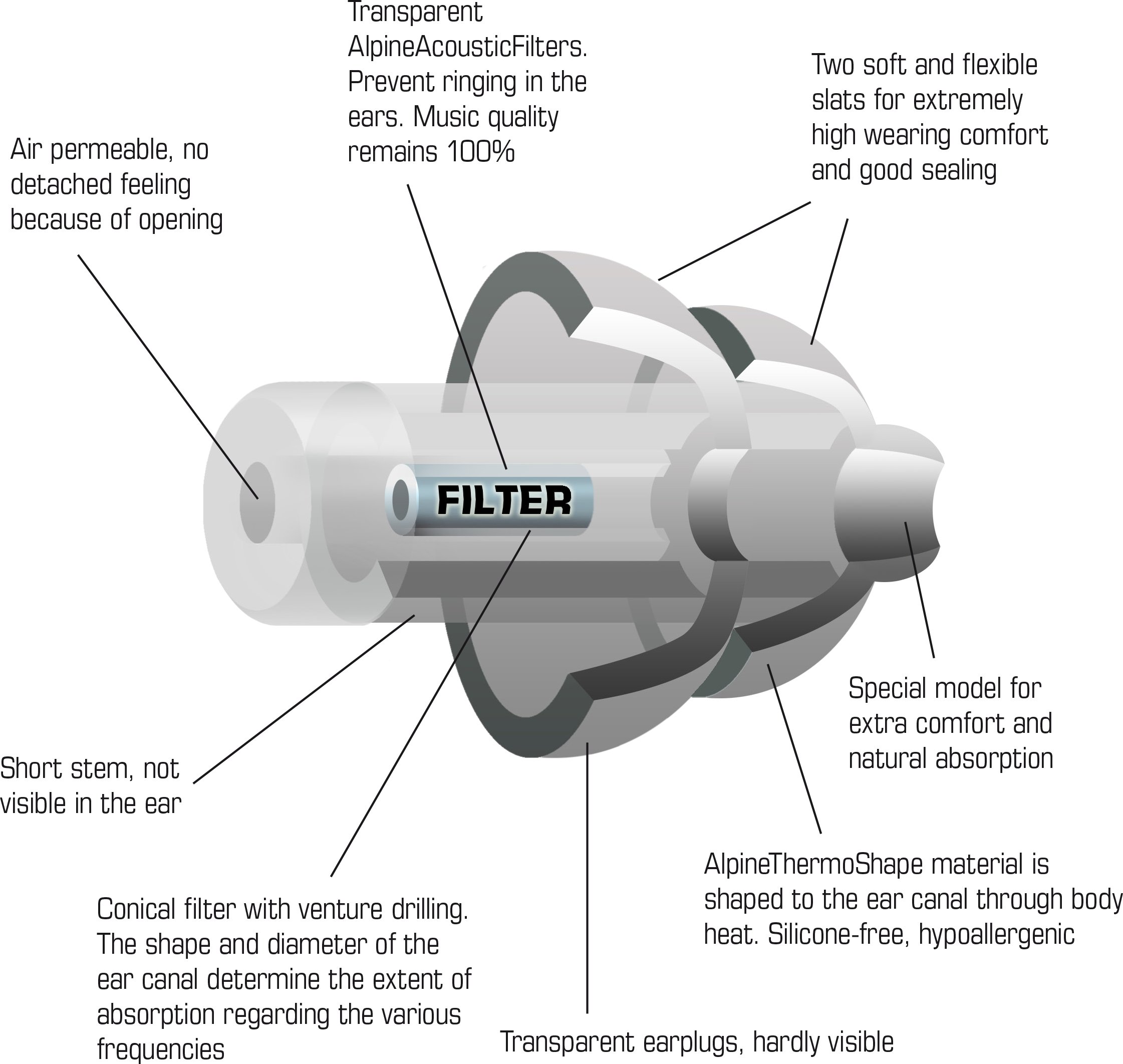 MusicSafe Pro natural sound ear plugs were created for professional musicians, but we have found these exceptional ear plugs are ideal for all kinds of applications found in everyday life. Choose MusicSafe Pro for the entire following applications: Music performance, whether you play an instrument, sing or direct. Music practice, especially for professional musicians, for music teachers, and their students. Attending music concerts. Many concerts today are so loud they are dangerous to your hearing and the extreme volume distorts the sound at your ear. With MusicSafe Pro, you are secure and You are going to hear the music better, with less distortion. Attending church products and services in which the music is too loud so that you can hear comfortably. Watching TV with a spouse who needs the volume too loud for your comfort. Attending all sorts of motorsports events including drag racing, tractor pulls, NASCAR events, motocross, and other such events. NOTE: you may need additional protection in the form of ear muffs worn over your MusicSafe Pros at extremely loud events. Noisy offices where you find it hard to concentrate. MusicSafe Pro Natural Sound ear plugs from Alpine Hearing Protection are the top-selling specialty ear plugs all across the European Union. Now these world-class high-tech ear plugs are available through Ear Plug Superstore to our customers in the US and the many other countries we serve. Your MusicSafe Pro package contains three different filter sets, providing you with a choice of low, medium, and high attenuation levels to suit many different situations. The calibrated acoustic filters provide optimum hearing protection without loss of sound clarity, so you’ll be able to still hear what you want to hear whilst you enjoy the hearing protection level you want. MusicSafe earplugs are very comfortable, and do not cause pressure on or in the ear. Instructions for use are included in the package.