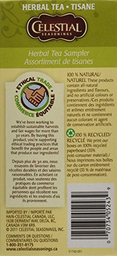 Experience Celestial Seasonings Herbal Tea Sampler. Our Herbal Tea Sampler Supplies Rejuvenation And Calm With 5 Of Our Favorite Herbal Teas. Explore The Flavors, Remedies And Advantages Of Our Herbal Tea. (Note: Description is informational most effective. Please refer to ingredients label on product prior to make use of and cope with any health questions in your Health Skilled prior to make use of.
