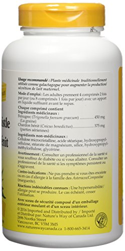 Ingredients: Every tablet accommodates 450 mg of Fenugreek Seed (Trigonella foenum-graecum) and 375 mg or Blessed Thistle (aerial parts) (Cnicus benedictus) for use as a lactation supplement.