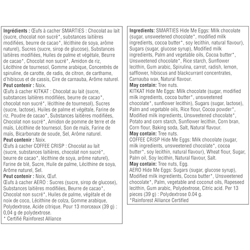 All Your Favourites In One Bag: Enjoy KITKAT milk chocolate eggs filled with crispy wafer pieces, SMARTIES milk chocolate eggs filled with miniature pieces of SMARTIES, COFFEE CRISP milk chocolate eggs with delicious COFFEE CRISP flavour and crispy wafer, and AERO milk chocolatey eggs filled with AERO’s classic bubbles