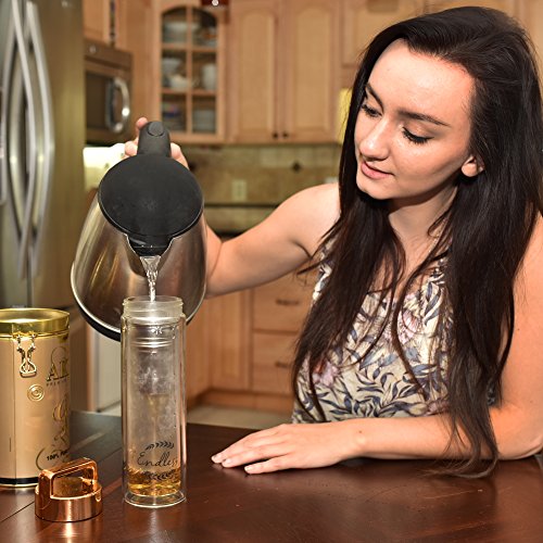 RELIABLE, DURABLE DESIGN: Tea lovers, you’re going to be thrilled! The premium quality double wall insulated glass of the insulated tea diffuser, the 100% BPA-free Tritan outside plastic pot and the unique handled gold twist-cap style infuser drinking cup ensure perfect spill & leak- proof drinking.