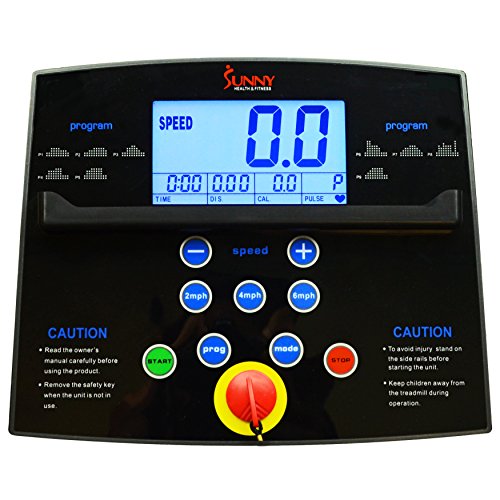 Get a great cardio workout without the usage of clunky, space-crowding equipment … the Sunny Health & Fitness Treadmill offers various options to keep your workout fun and effective, whilst saving you precious space in your house. Additional Features Handrail controls for quick adjustments Convenient built-in phone and tablet holder Easy folding for optimum and secure storage Soft drop-down feature is quiet and protects flooring LCD screen to keep track of time, speed, and calories About Sunny Health & Fitness Sunny Health & Fitness has been importing and distributing high-quality health and fitness products for over ten years. From their headquarters in Los Angeles, California, they import equipment from direct sources in Taiwan and China to provide more competitive pricing than the average health and fitness equipment distributor. Because they’re committed to excellence and stand at the back of the quality of every one of their products, Sunny Health & Fitness has transform one of the vital fastest-growing companies available in the market. Offers built-in workout programs for varied workout. 9 preset workouts to vary your routine. 2.20 Peak Horse Power drive system. 3-position manual incline. Maximum weight capacity: 220 lbs.. Manufacturer’s warranty included (see Guarantee & Returns). 62.2L x 26.8W x 18.3H inches.