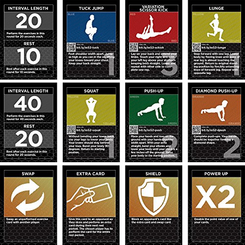 You will get a truly effective, fun, and unique workout. HIIT workouts can last as little as 4 minutes and still produce awesome results. For the most fun, play with your family and friends. Use the strategy cards to boost your points or tire your opponent out by giving him/her an extra exercise card.