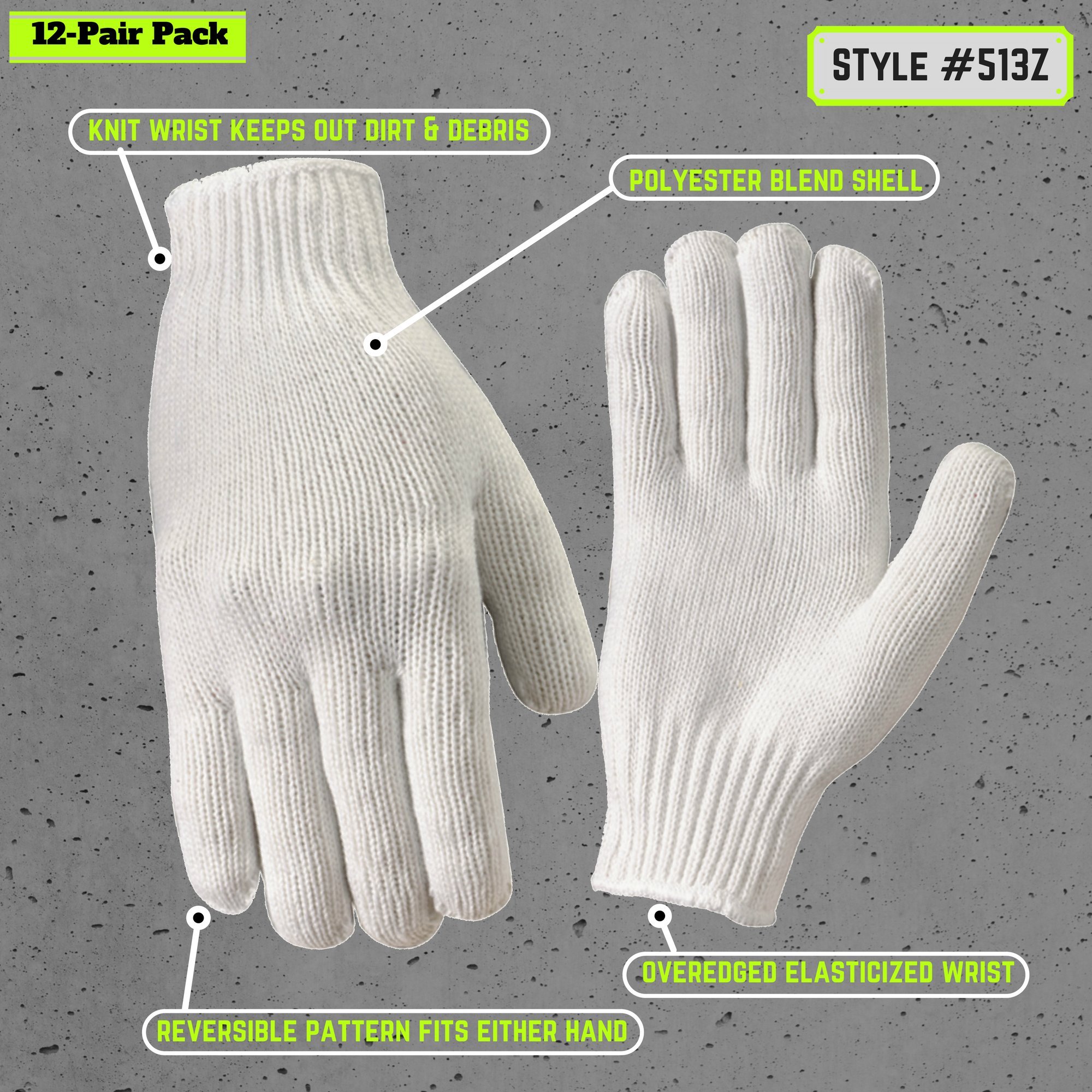 Polyester blend knit glove with an over edged elasticized knit wrist to keep dirt and debris out of the glove